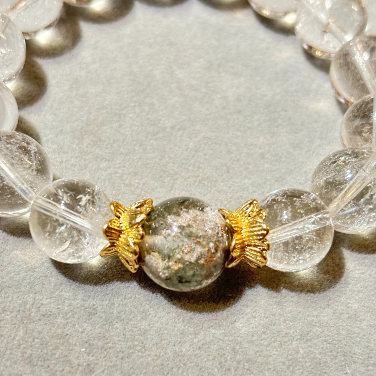 透明度の高いクリアクォーツと、力強い成長のエネルギーを宿すグリーンファントムを組み合わせた、世界にひとつだけの天然石ブレスレットです。