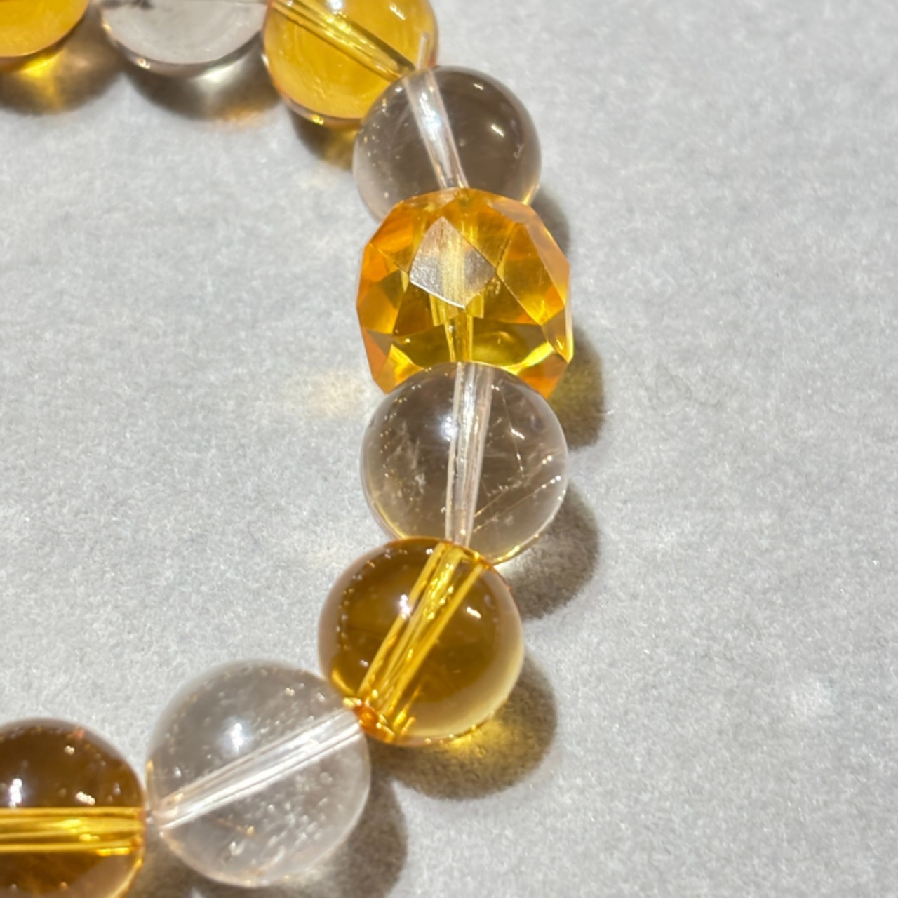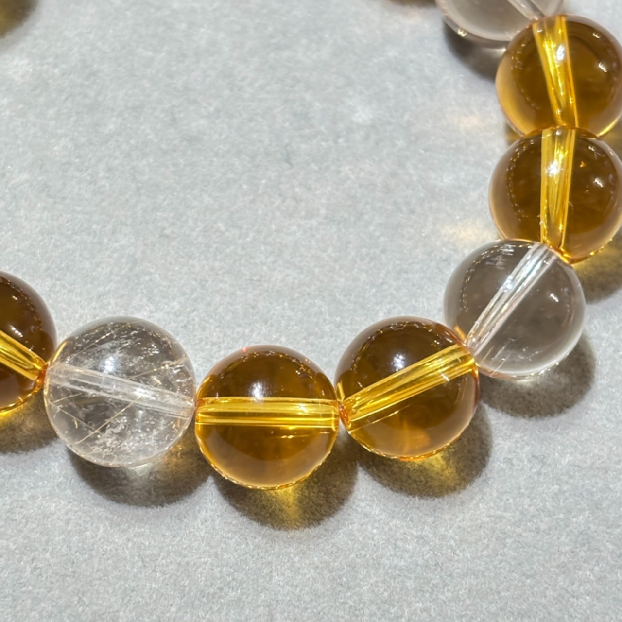 輝くような黄金色が美しい「シトリン」と、透明感あふれる「クリアクォーツ(水晶)」を組み合わせた、世界にひとつだけの天然石ブレスレットです。