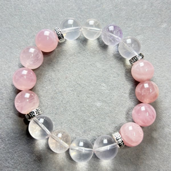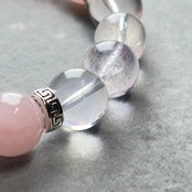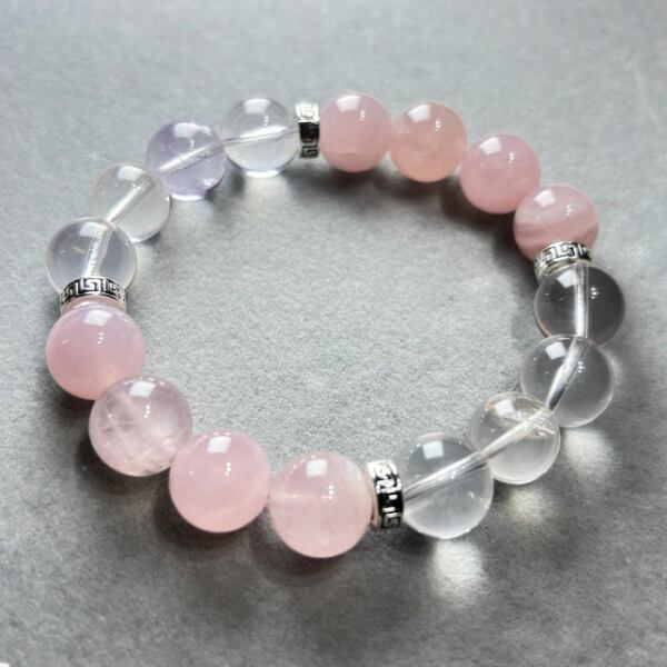 愛と癒しを象徴するローズクォーツを、質感の異なる2種類で贅沢に組み合わせたブレスレットです。ほんのり濃いピンクが可憐なマダガスカル産ローズクォーツと、クリアな透明感が清らかな印象を与えるクリアタイプのローズクォーツ。柔らかなトーンのグラデーションが手元を明るく見せ、身につけるだけで気持ちを穏やかに整えてくれます。シンプルなシルバーカラーのメタルパーツが甘さを引き締め、日常使いにも合わせやすいデザインです。