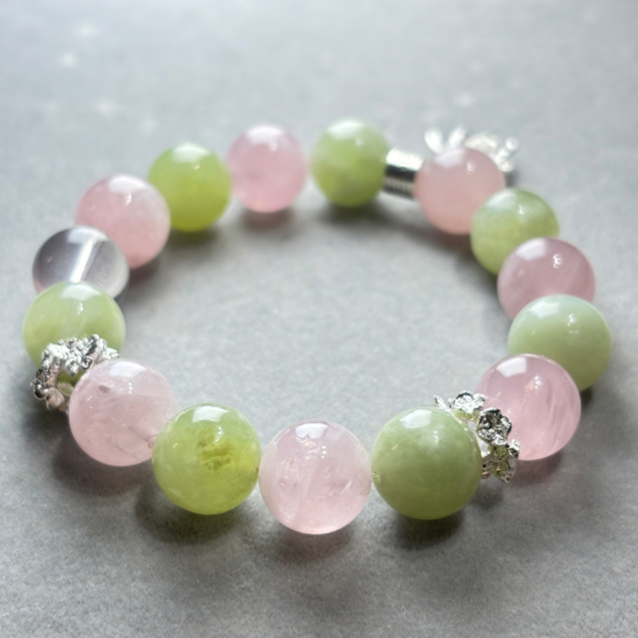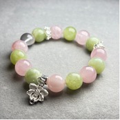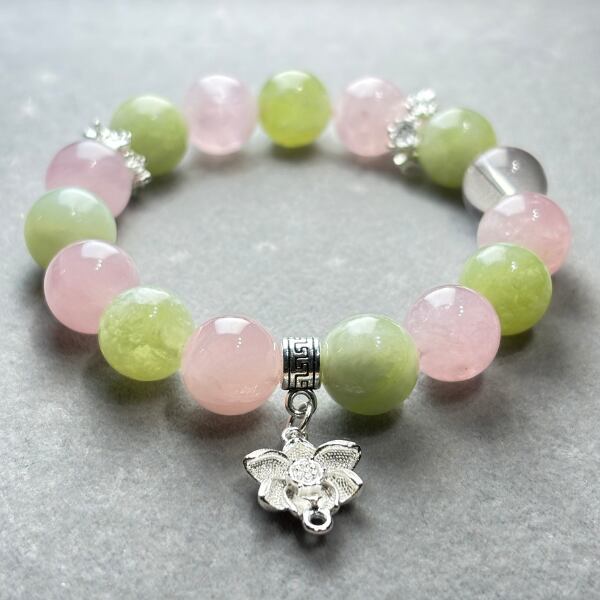淡いピンクとグリーンの色合いが、まるで春の光のように心をほぐす天然石ブレスレット。